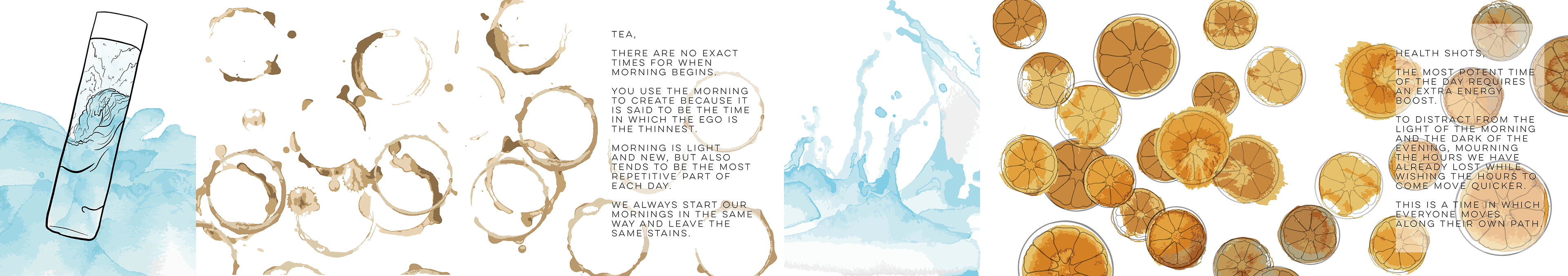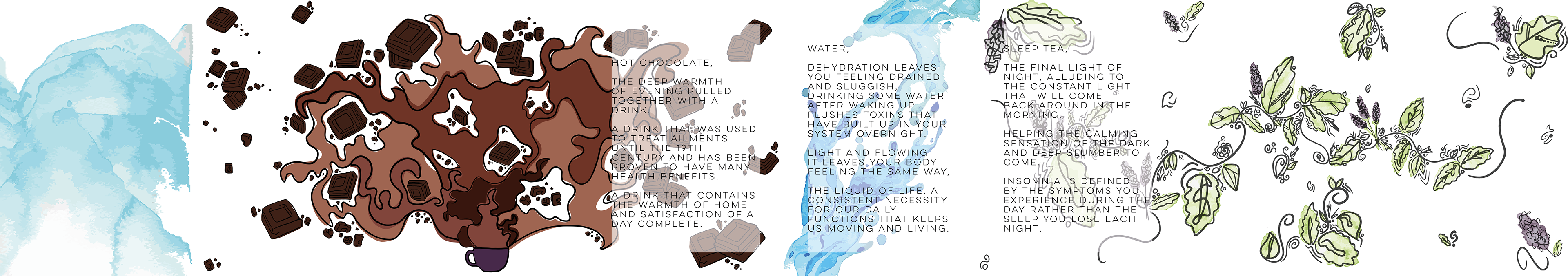 My personal drink routine and what these drinks mean to me, within a day and a week. All work created by converting watercolour into vector images on Illustrator with the page layout created on Indesign.